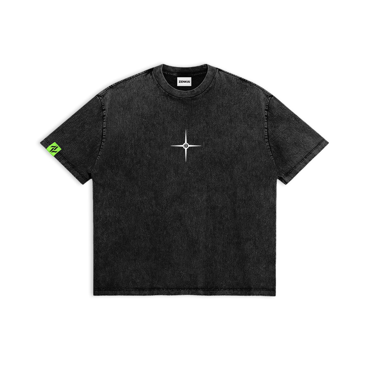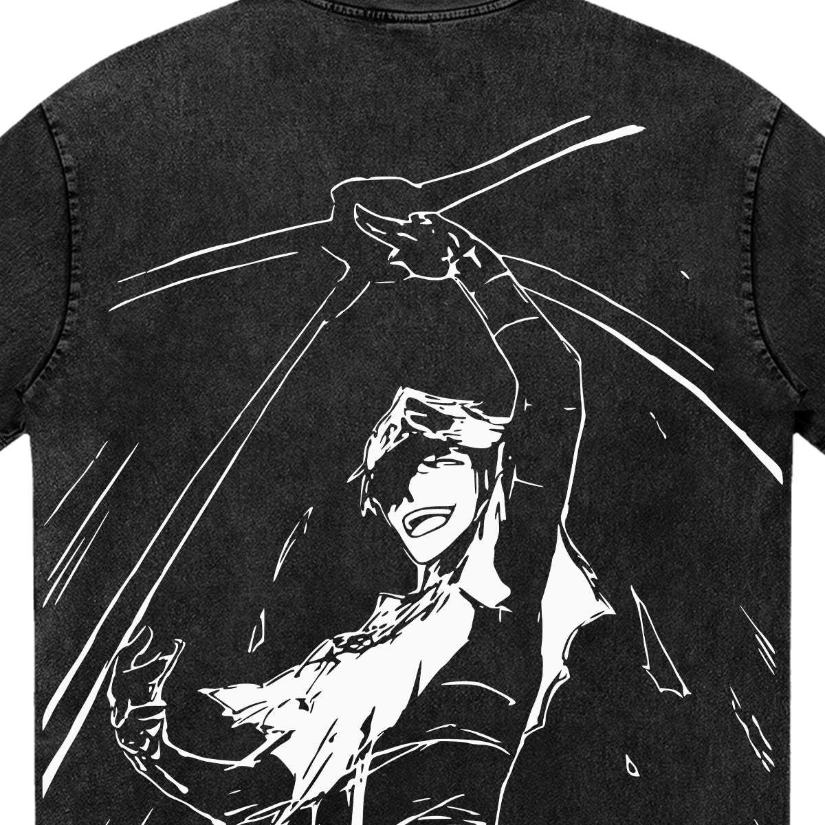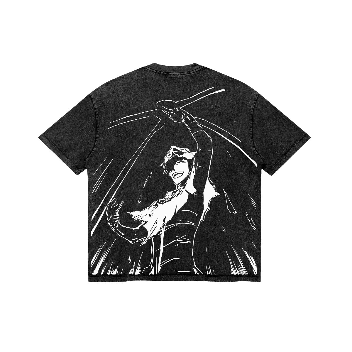 Stand Above the Heavens. A striking and minimalist tribute to Sousuke Aizen’s transcendence. The front of this mineral-washed tee features a clean, white four-pointed star—the symbol of his complete control and his evolution beyond Shinigami limits. The back showcases a bold, high-contrast manga-style illustration of Aizen himself, captured in a moment of triumphant power as he ascends to his new throne. With its sharp lines and negative-space aesthetic, this design reflects the cold, calculating nature of the man who planned everything from the start. For those who play the long game and settle for nothing less than absolute perfection.