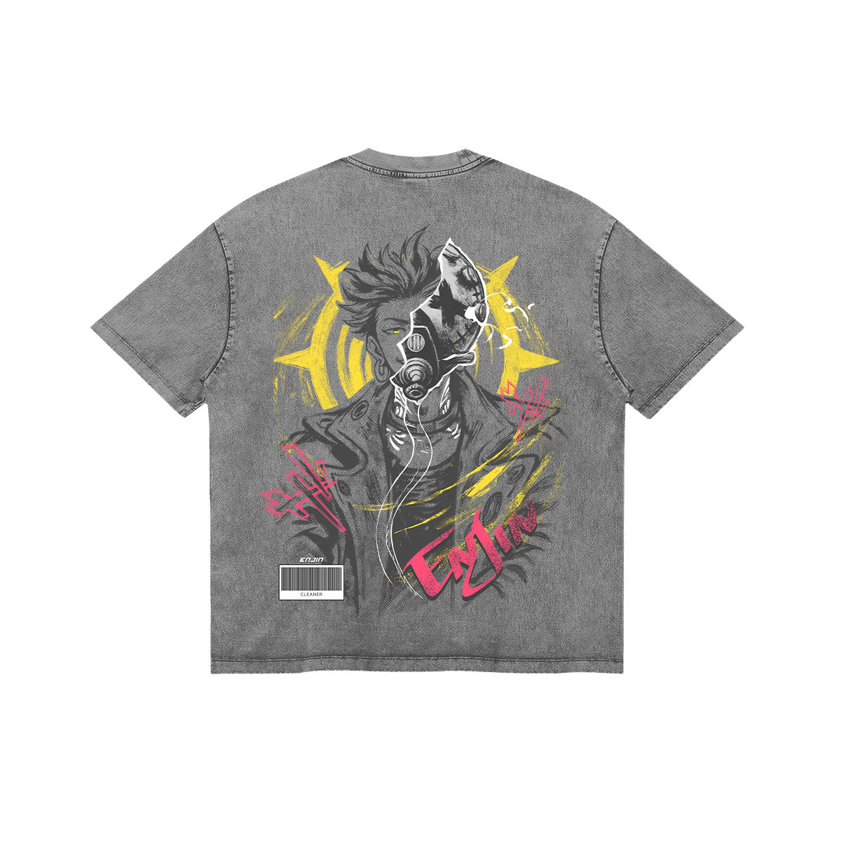 Artifact Specialist. A rugged and stylish tribute to Enjin, the man who showed Rudo the true power of "Givens." The front of this mineral-washed tee features his signature crossed-out eye mask, while the back showcases a high-energy portrait of Enjin himself. The design is saturated with vibrant yellow and hot pink accents, reflecting his bold personality and the chaotic beauty of his combat style. With its industrial aesthetic and graffiti-inspired details, this piece is a must-have for those who see the hidden potential in everything and value the bond between a mentor and a student.
