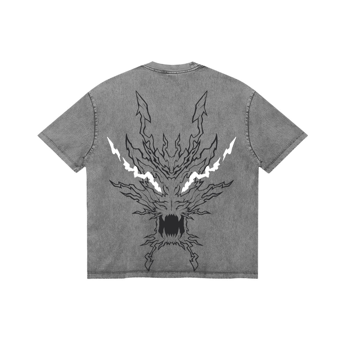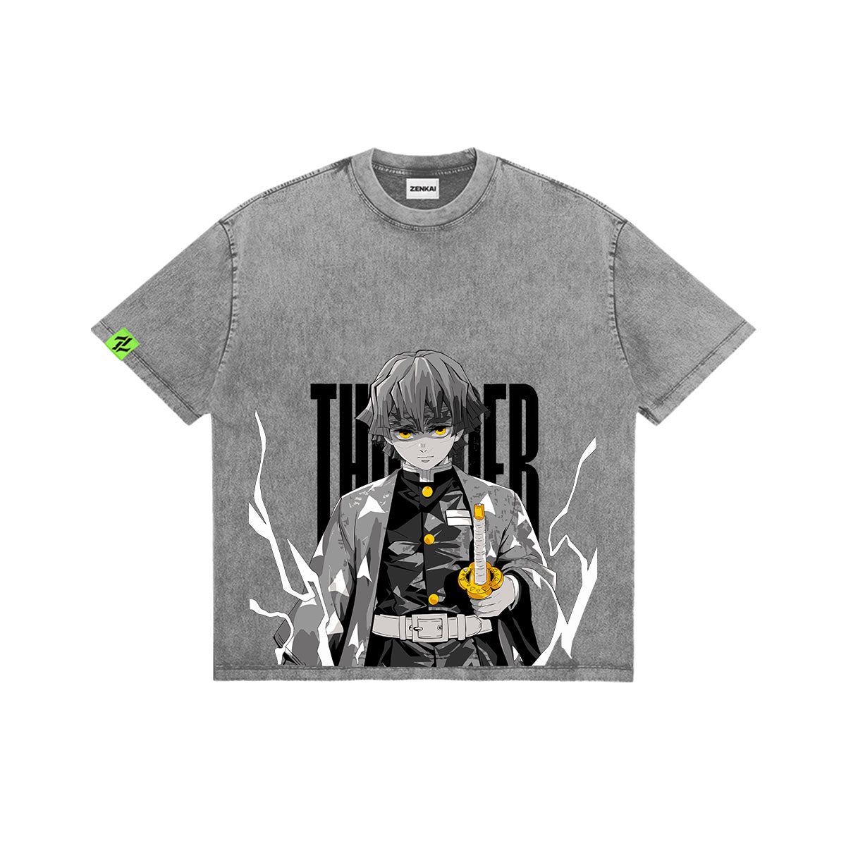 The Speed of Lightning. A striking tribute to Zenitsu Agatsuma and his mastery of the First Form. The front of this mineral-washed tee features Zenitsu in his iconic iaido stance, eyes closed in total concentration, with the bold "THUNDER" typography looming behind him. The back reveals a massive, stylized dragon made of pure electric energy—a visual representation of the raw power unleashed by his blade. Set against a rugged grey canvas, this design captures the duality of Zenitsu: the fearful boy and the lethal warrior who moves faster than the eye can see. For those who find their strength in the heat of the moment.