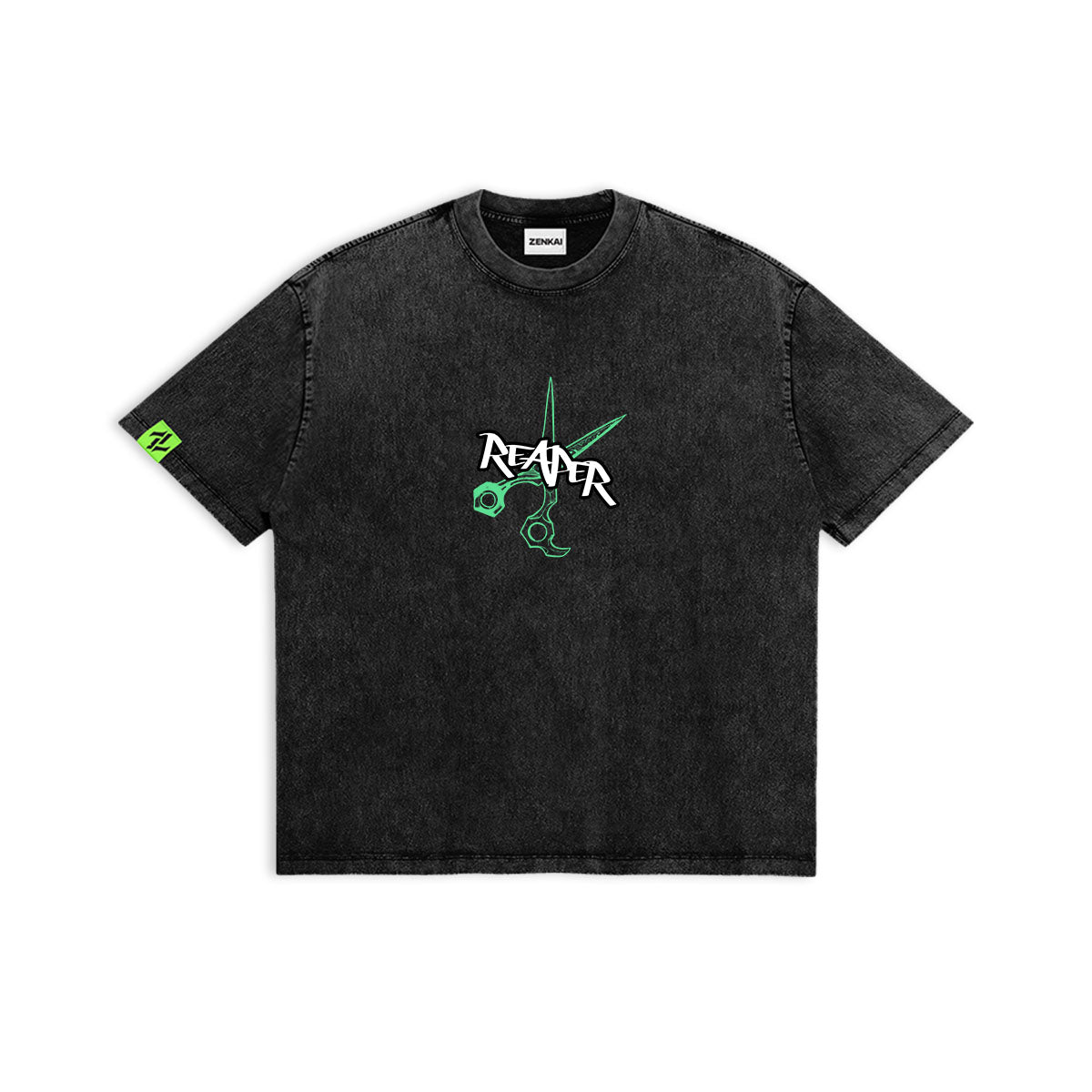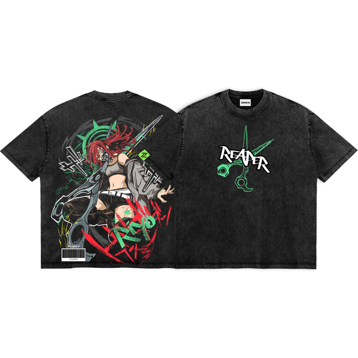 Sharp Style. Lethal Precision. A high-energy tribute to Riyo, the fearless fighter who slices through the chaos of the Abyss. The front of this mineral-washed tee features a minimalist "REAPER" logo integrated with her signature scissor blades. The back is a visual explosion, showcasing Riyo in a dynamic combat pose, surrounded by neon green and crimson energy slashes. Rendered in the gritty, graffiti-inspired art style of Gachiakuta, this design captures her playful yet deadly nature. For those who aren't afraid to