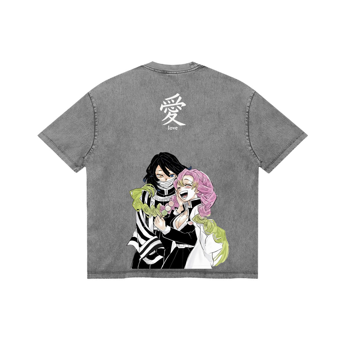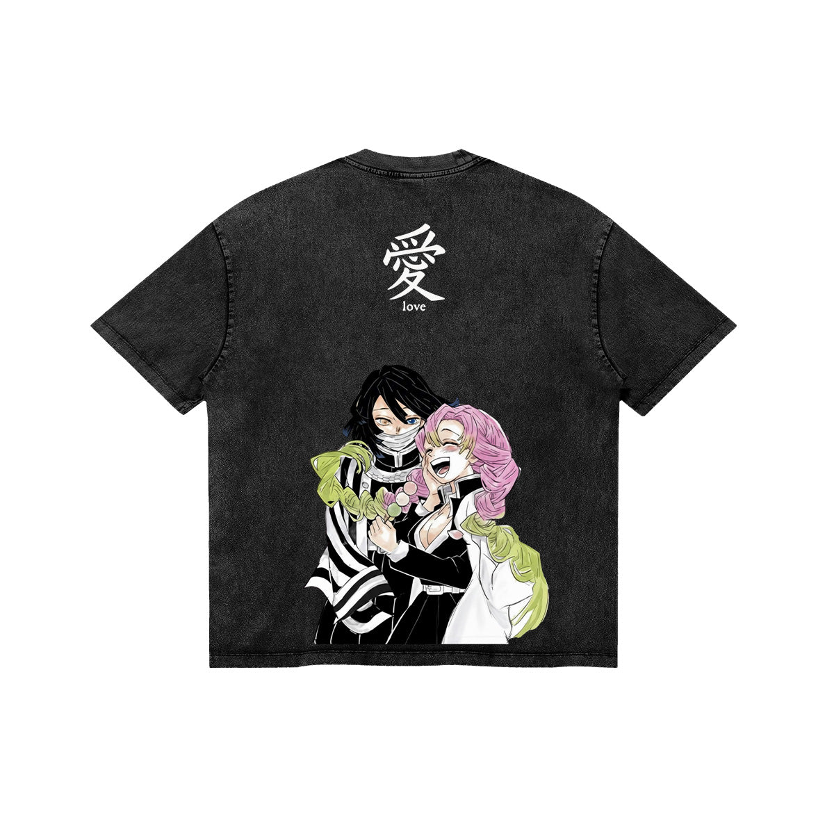 Bound by Eternity. A beautiful and serene tribute to the enduring love between Obanai Iguro and Mitsuri Kanroji. The front of this mineral-washed tee features a subtle, embroidered-style icon of a serpent coiled around a katana hilt. The back showcases a vibrant, high-contrast illustration of the two Hashira in a rare moment of peace, crowned by the kanji for "Love." Set against a premium dark canvas, this design captures the tragic beauty of their shared destiny. For those who believe that even in a world of monsters, love is the ultimate strength.