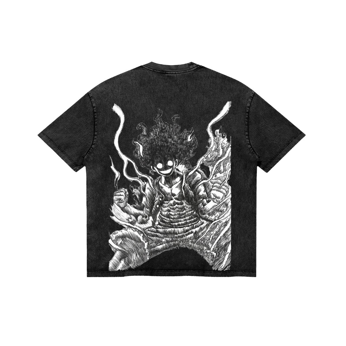 The Storm of a New Era. A raw and powerful tribute to the moment Luffy’s spirit truly breaks free. This design captures the King of the Pirates in a state of pure, chaotic energy, rendered in a high-contrast manga style that pops against the dark mineral-washed fabric. With hair like flickering white flames and a gaze that pierces through the dark, it embodies the terrifying yet joyful strength of a man who will stop at nothing to reach the top. For those who embrace the chaos and carry the fire of ambition.